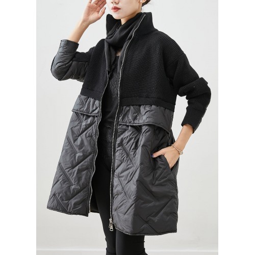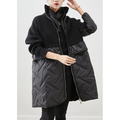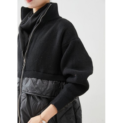 Women Black Zip Up Patchwork Fine Cotton Filled Knit Coat Winter