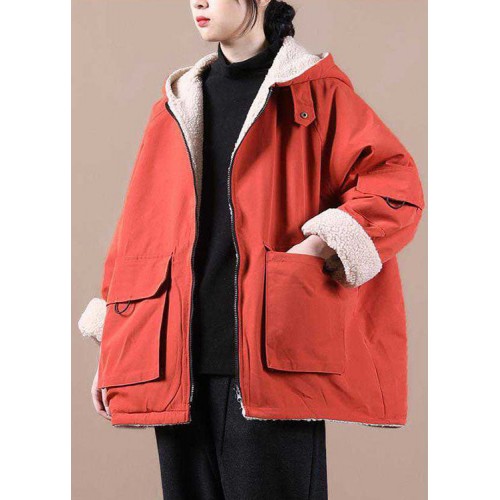 Fashion Orange hooded zippered Pockets Loose Winter parkas Coat